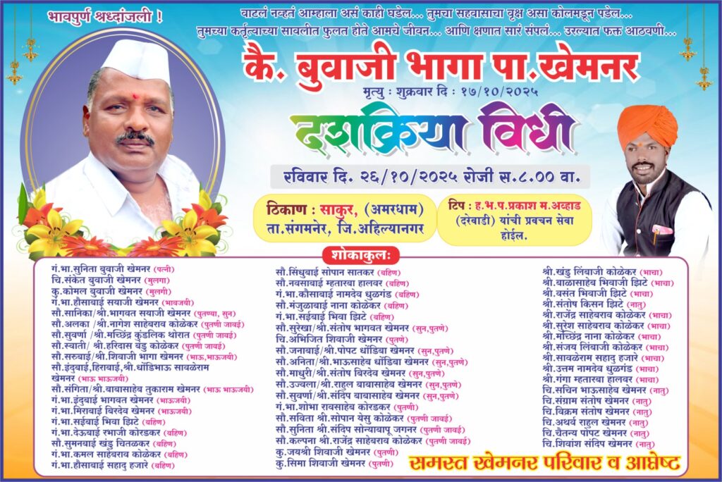 दोन भाजप नेते गेल्याने मंत्री विखे यांनी सत्कार केला रद्द दिपावली स्नेहमिलन कार्यक्रमा निमित्त आयोजित कार्यक्रमात राहुरी तालुक्याचे विधान सभा सदस्य आणि अहिल्या नगर जिल्हा मध्यवर्ती बँकेचे चेअरमन स्व.आमदार.शिवाजीराव कर्डीले तसेच संगमनेर तालुक्याच्या पठार भागातील साकुरचे भाजप नेते स्व.बुवाजी खेमनर यांचे निधन झाले आहे त्यामुळे मंत्री विख यांनी सत्कार रद्द करून या दोन्ही नेत्यांना भावपूर्ण श्रध्दांजली वाहिली