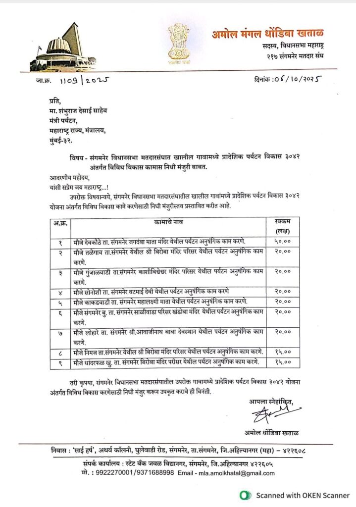 संगमनेर तालुक्यातील देवकौठे येथील जगदंबा माता मंदिरात एका कार्यक्रमा निमित्त आमदार अमोल खताळ गेले होते. त्यावेळी मंदिराच्या विकासासाठी निधी द्यावा अशी मागणी ग्रामस्थांनी केली होती. या मंदिराच्या विकासासाठी निधी दिला जाईल असा शब्द आ खताळ यांनी ग्रामस्थांना दिला होता. त्यानुसार राज्याचे पर्यटन विकासमंत्री शंभूराज देसाई यांची मंत्रालयात भेट घेऊन संगमनेर तालुक्या तील मंदिरांच्या सुशोभीकरणासाठी निधी देण्यात यावा असे पत्र दिले होते. मंत्री देसाई यांनी देवकौठे येथील जगदंबा माता मंदिर सुशोभीकरण कामासोबतच संगमनेर तालुक्यातील ९ मंदिरांच्या सुशोभीकरणासाठी २ कोटी रुपये मंजूर केले आहे.
